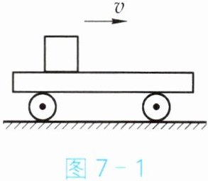 例题 放在一辆足够长且表面光滑的平板车上的物体,随车一起在水平方向上做匀速直线运动(图 7 - 1)。当车突然停止时,这个物体将(