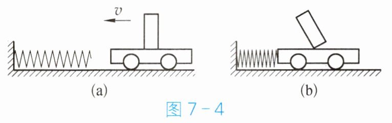 8. 图 7 - 4(a)(b) 是一辆小车驶向弹簧的运动过程。小车碰到弹簧后,弹簧被压缩,表明力能使物体发生