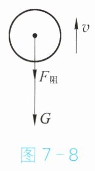 分析 篮球在上升过程中,不仅受到竖直向下的重力$G$,还受到阻碍篮球上升的空气阻力$F_{阻}$的作用,阻力的方向竖直向下(图7-8)。篮球受到的两个力在同一直线上且方向相同,则合力的大小$F = G + F_{阻}$,方向为竖直向下。
