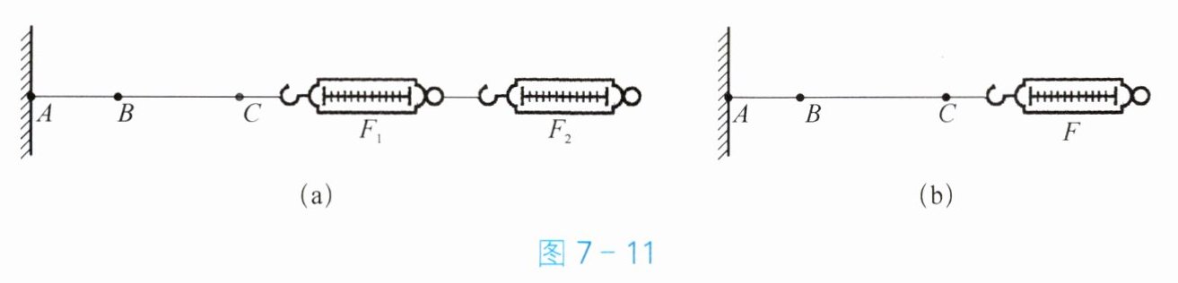 10. 某同学为探究作用在同一物体上沿同一直线的两个力,其合力与这两个力之间的关系,利用了橡皮筋(原长为$AB$)、弹簧测力计等器材进行实验。实验时,先将橡皮筋的$A$点固定在墙上,再按图7-11(a)中的方式用两个弹簧测力计同时作用在$B$点,将橡皮筋从$B点拉伸到C$点,记下此时两个弹簧测力计的示数$F_1和F_2$。接着按图7-11(b)中的方式用一个弹簧测力计作用在$B$点,依然将橡皮筋拉伸到$C$点,记下此时弹簧测力计示数$F$。按上述操作重复三次实验,实验数据见下表。