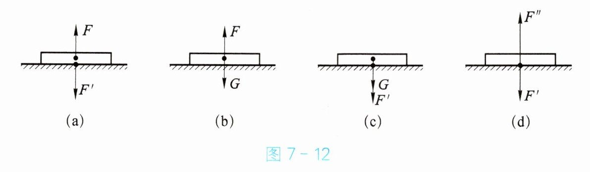 分析 选项 A 中,压力的受力物体是桌面,支持力的受力物体是课本,虽然这两个力大小相等,方向相反,作用在同一条直线上,但不是作用在同一物体上,所以它们不是平衡力。选项 B 中,重力的受力物体是课本,支持力的受力物体也是课本,这两个力作用在同一物体上且大小相等、方向相反,满足二力平衡的条件,所以它们是平衡力。选项 C 中,这两个力虽然大小相等,但分别作用在课本和桌面上,且方向都向下,所以它们不是平衡力。选项 D 中,这两个力虽然作用在同一物体,即桌面上,但大小不相等,所以它们不是平衡力。图 7 - 12 是各选项中描述的力的示意图,通过图示可以更直观地进行判断。