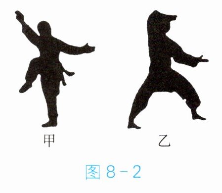 - 举一反三 太极拳被列为世界级非物质文化遗产。一位太极拳爱好者在打拳过程中展示了图8-2中的甲、乙两种站姿,在保持这两种站姿静止时,他对地面的压力和压强分别为$ F_{甲} $、$ F_{乙} 和 p_{甲} $、$ p_{乙} $。下列关系式中正确的是(