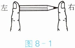 如图8-1所示,两手指水平压铅笔两端,左边手指受到的压力为$ F_{1} $,压强为$ p_{1} $,右边手指受到的压力为$ F_{2} $,压强为$ p_{2} $。下列说法中正确的是(