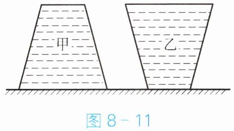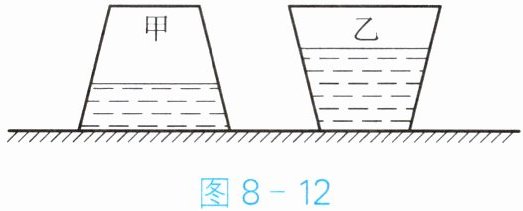 - 举一反三 同一个密封的圆台形容器未装满水,放在水平桌面上。如图8-12所示,放置方式由甲变为乙,关于水对容器底部的压强$p_{1}以及整个容器对桌面的压强p_{2}$的变化情况,下列说法中正确的是(