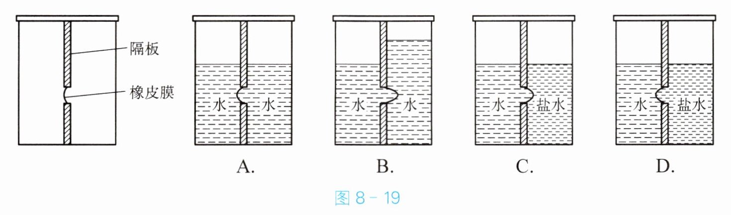 4. 某同学用图8-19中的容器来探究液体内部压强的特点。容器中间用隔板分成左右两部分,隔板上有一圆孔被橡皮膜封住。往容器中加入液体后,橡皮膜两侧压强不同时,其形状会发生改变。图8-19的示意图中符合实验事实的是(