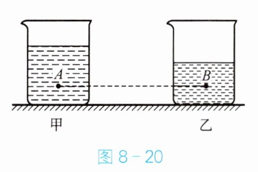 6. 如图8-20所示,完全相同的甲、乙两个烧杯放在水平桌面上,烧杯中装有密度不同的液体。若距杯底同一高度处有$A$、$B$两点,其受到液体的压强相等,甲、乙烧杯中液体对杯底的压强分别为$p_{甲}$、$p_{乙}$,甲、乙烧杯对桌面的压强分别为$p_{1}$、$p_{2}$,则下列判断中正确的是(