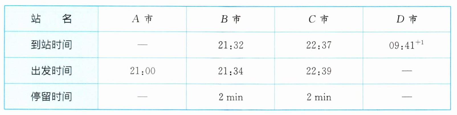 下表是从 $A$ 市到 $D$ 市的某特快列车的运行时刻表。请根据表中数据回答问题: