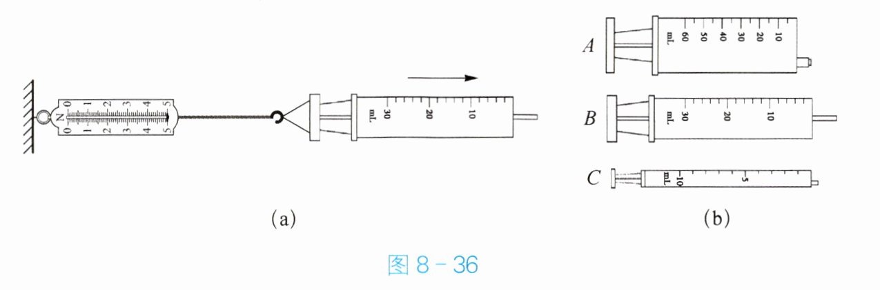 (选填“大”或“小”)。(5)若同学们用图8-36(a)中的装置测量大气压强,所用器材为图8-36(b)中的B注射器、量程为0~5N的弹簧测力计、刻度尺等。当弹簧测力计被拉到5N,若活塞仍没有滑动,可改用图8-36(b)中的