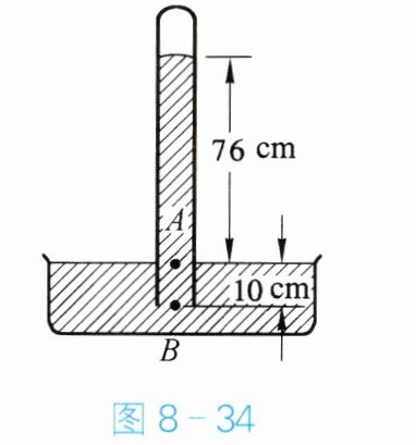 8. 图8-34是托里拆利实验的示意图,如果测得大气压强为760mmHg*,则图中A点的压强$p_{A}= $