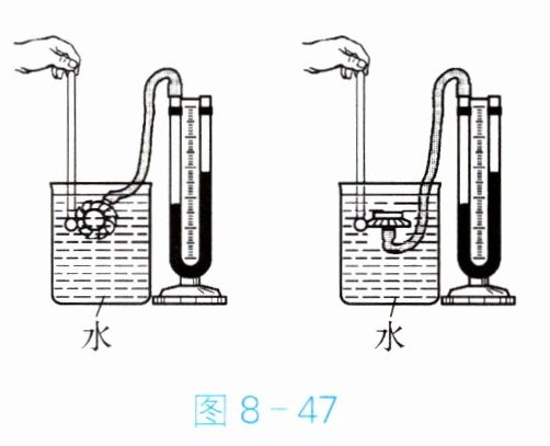 4. 如图8-47所示,把U形管压强计的金属盒分别放入同一杯水中的相同深度处。以下是可能影响液体压强的因素,图中实验探究的是(