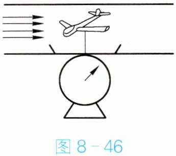 7. 某科技馆内,有一个风洞实验室,一架飞机模型固定在托盘测力计上,如图 8-46 所示。无风时,托盘测力计的示数为 15 N;当迎面吹着飞机的风速达到 20 m/s 时,托盘测力计的示数为 7 N,由此可以判定飞机受到了另一个力。那么,飞机受到的另一个力的大小为