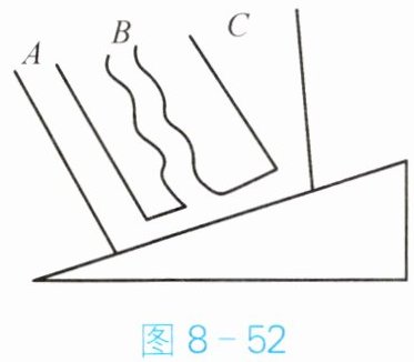 17. 如图8-52所示,将一连通器置于斜面上,在连通器中注入适量的水,画出连通器$A$、$B$、$C$三根管子中液面的位置(用虚线表示)。