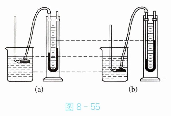 (2)如图8-55所示,小唐把金属盒分别浸入两种液体中,发现图(a)中U形管两边的液柱高度差较小,小唐认为该图中烧杯盛有酒精。此结论是不可靠的,因为没有控制金属盒在液体中的