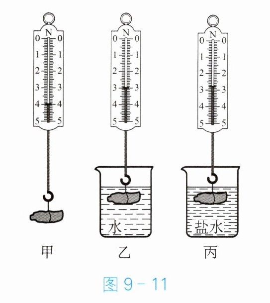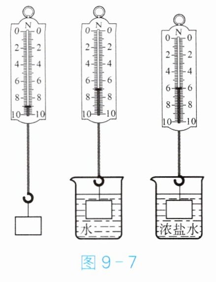 3. 小月探究影响浮力大小的因素,实验情景如图 9 - 7 所示。当铁块在空气中、浸没在水和浓盐水中静止时,弹簧测力计的示数分别是 9 N、7 N、6 N。下列说法中