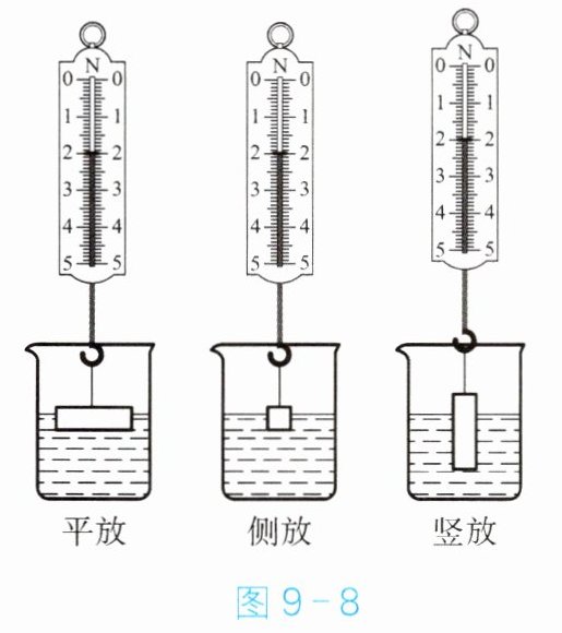 1. 如图 9 - 8 所示,小聪用一个长方体铝块探究影响浮力大小的因素。他先后将铝块平放、侧放和竖放,使其部分浸入同一杯水中,并保证每次水面到达同一标记处,再比较弹簧测力计的三次示数。该实验探究的影响浮力大小的因素是(