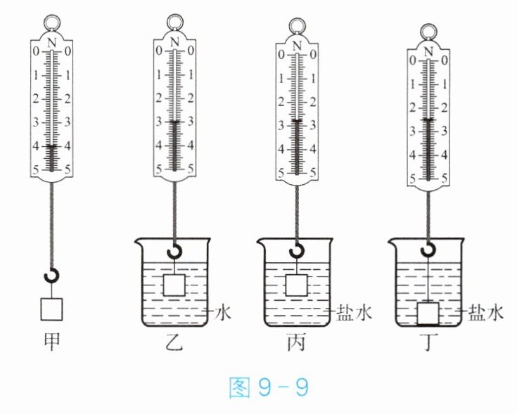 2. 图 9 - 9 是“探究浮力大小与哪些因素有关”的几个实验情景,实验甲、丙和丁中,弹簧测力计的示数分别为 4.0 N、2.8 N 和 2.5 N。若盐水的密度为$ 1.2×10^3 kg/m^3,$则下列结论中