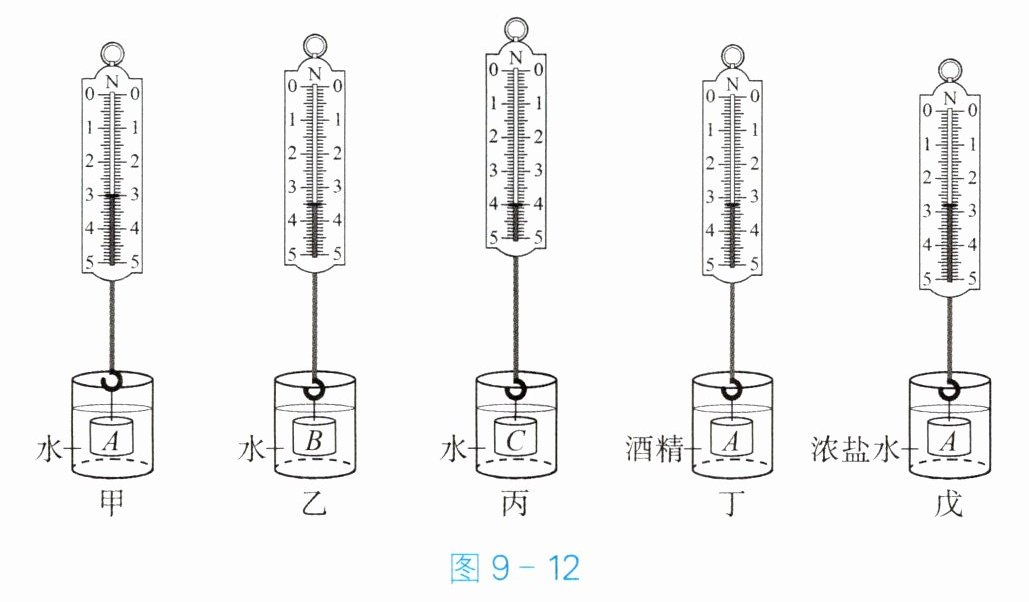 6. 如图 9 - 12 所示,为了探究浮力大小与物体密度和液体密度的关系,实验中使用了体积相同,密度不同的三个圆柱体 A、B、C,用弹簧测力计测得它们的重力分别为 4 N、4.5 N 和 5 N。甲实验中,圆柱体 A 所受浮力的大小为
