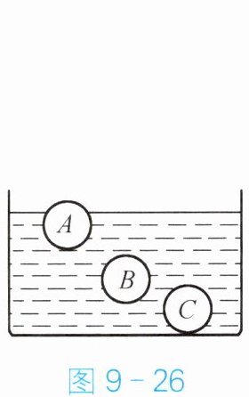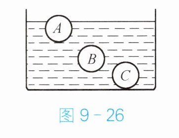 4. 如图 9 - 26 所示,将体积相同的三个小球 A、B、C 放入同一液体中,静止时,球 A 漂浮,球 B 悬浮,球 C 沉底,则三个小球受到的浮力 $ F_{A} $、$ F_{B} $ 和 $ F_{C} $ 的大小关系为