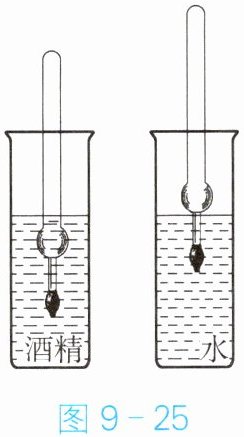3. 密度计是测量液体密度的工具。当它静止时,与液面相交处的刻度值即为待测液体的密度值。如图 9 - 25 所示,将同一支密度计先后放在酒精和水中,当其静止时,密度计在酒精中受到的浮力