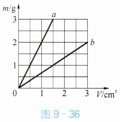 8. $a$、$b$两种物质的质量和体积关系图像如图 9 - 36 所示。若分别用$a$、$b$两种物质制成体积相等的甲、乙两个实心物体,将它们浸没在水中,放手稳定后能观察到的现象及其成因是(