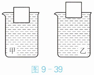 15. 完全相同的两个容器分别盛满甲、乙两种不同的液体,再将完全相同的两个物体分别放入其中,物体静止时如图 9 - 39 所示。若溢出液体的质量分别为$m_{甲}$、$m_{乙}$,甲、乙两种液体的密度分别为$\rho_{甲}$、$\rho_{乙}$,液体对容器底部的压强分别为$p_{甲}$、$p_{乙}$,则$m_{甲}$