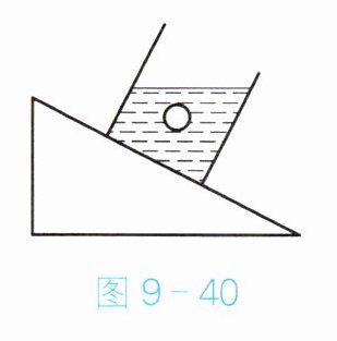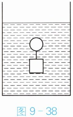10. 用细线连在一起的小球和铁块,恰能悬浮在盛有水的柱形容器内(图 9 - 38)。若向下轻轻拨动铁块,则小球和铁块的浮沉情况及水对容器底部的压强变化情况分别是(