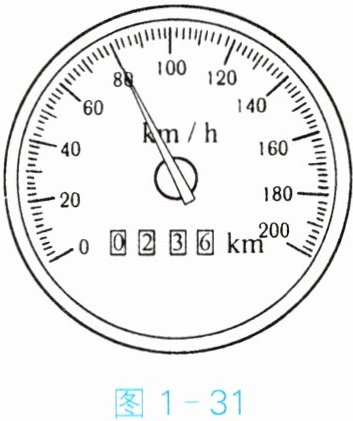 2. 汽车司机座位前安装有速度表,它可以显示汽车的行驶速度。如果速度表的示数如图 1-31 所示,那么,汽车以这个速度行驶 30min 通过的距离是(