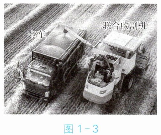 4. 小麦喜获丰收,人们会大量采用联合收割机抢收小麦。如图 1 - 3 所示,在收割过程中,卡车和联合收割机以相同快慢向同一方向行驶。此时,若以联合收割机为参照物,卡车是