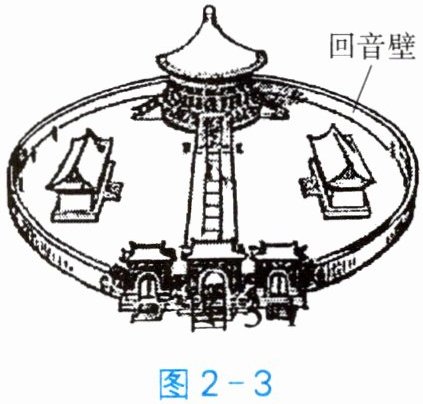 回来,这种现象称为回声。北京天坛内有个回音壁(图 2 - 3),人对着墙壁说话,在墙壁的许多位置都能听到,这是由于声音的反射而形成回声