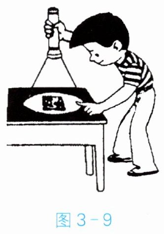 6. 晚上,在桌上铺一张白纸,把一小块平面镜放在纸上,让手电筒的光正对着平面镜照射,如图3-9所示。从侧面看去,发现(