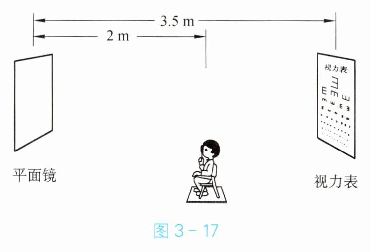 2. 视力检测时要求被测者与视力表的距离为$5m$,由于室内空间有限,医生会利用平面镜成像的特点来解决空间局促的问题。图3-17是同学测视力的情景,视力表与平面镜的距离是$3.5m$。为满足测量要求,下列说法中正确的是(