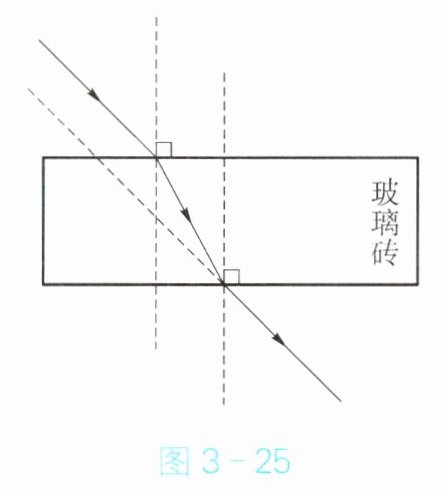 - 分析 如图3 - 25所示,光从空气斜射入玻璃时,根据光的折射规律,折射角小于入射角,所以玻璃中的折射光线靠近法线。因为长方体玻璃砖上下两个界面互相平行,所以当光从玻璃斜射到空气时,根据光路可逆,第二次的折射角与第一次的入射角大小相等。第二次的折射光线与第一次的入射光线平行。