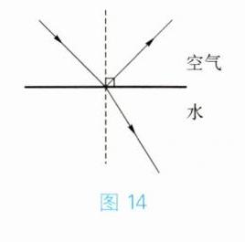 14. 如图 3 - 40 所示,一束光从空气斜射入水中,请画出它的反射光线和大致的折射光线。