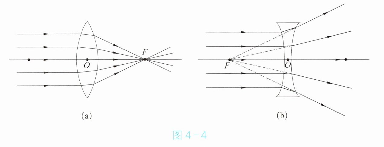 - 如图4-4(a)所示,与主光轴平行的光通过凸透镜后会聚在主光轴上的 $ F $ 点, $ F $ 点叫做
