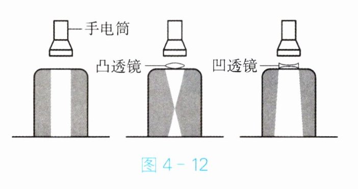 6. 如图4-12所示,玻璃杯中充以烟雾,倒扣在桌面上,在杯底放一块凸透镜或凹透镜,用手电筒射出一束平行光,垂直照射透镜。此实验是探究透镜