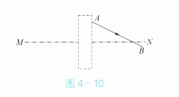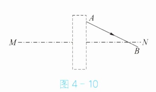 3. 如图4-10所示,$ AB $ 为一条通过透镜折射后的光线,$ MN $ 为该透镜的主光轴。下列说法中
