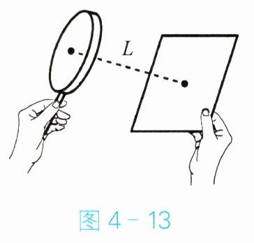 (2)如果没有仔细调节白纸与凸透镜之间的距离,纸上的光斑不是最小,这种情况下测出光斑到凸透镜光心的距离为 $ L $(图4-13),则凸透镜的焦距(