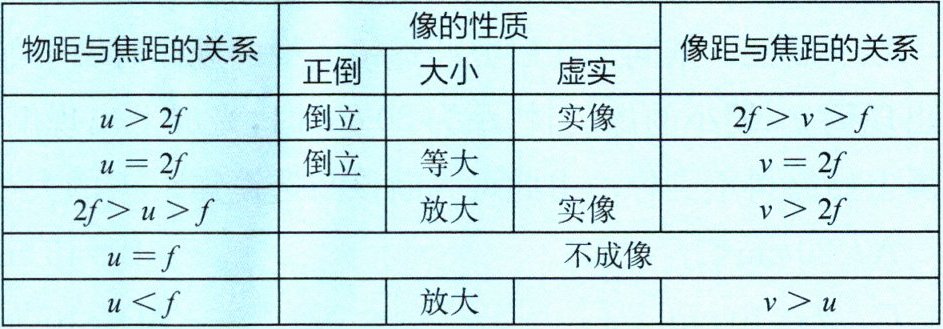 |放大|实像|$v>2f$||$u = f$| | |不成像| |