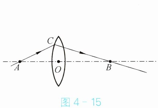 如图$4 - 15$所示,$A$、$B$均为凸透镜主光轴上的点,光线$AC经透镜折射后过B$点。已知$AO为12\space cm$,$OB为16\space cm$,则该凸透镜的焦距可能是(