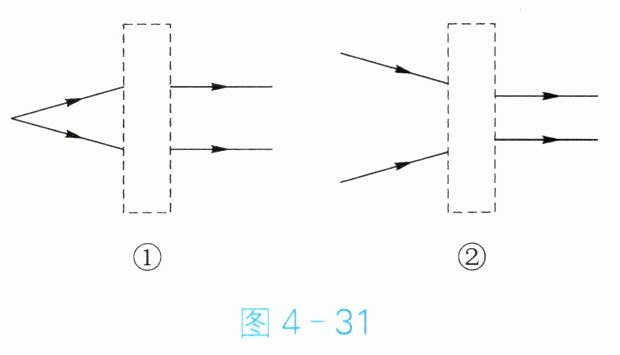 (选填“前”或“后”)。图$4 - 31$是光通过透镜前后的情形(图中虚线框内的透镜未画出),矫正远视眼时只要在眼睛前面放置图①