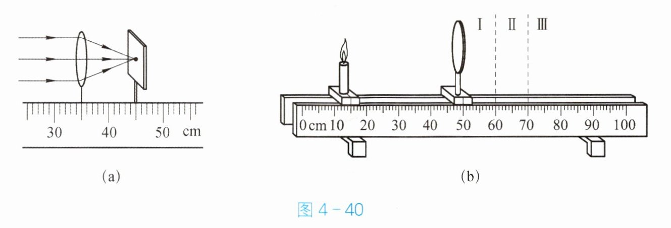 (1)如图4-40(a)所示,小明让一束平行光正对凸透镜照射,在凸透镜另一侧的光屏上得到一个最小、最亮的光斑,则凸透镜的焦距是