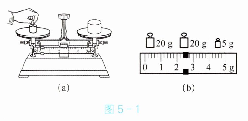 例题 小明同学在测量物体质量的实验中,调节天平平衡后,按如图 5 - 1(a)所示的方法来测量物体的质量。