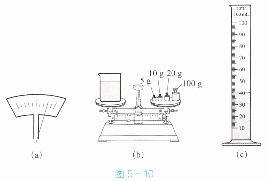 (1)将托盘天平放在水平桌面上,游码移至称量标尺左端的零刻度线上,此时分度盘指针的位置如图 5 - 10(a)所示,则应向