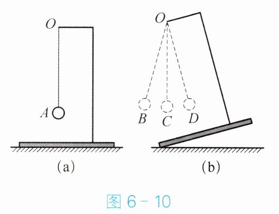 4. 细线 $ OA $ 下端悬挂一个小球,静止时如图 6 - 10(a) 所示。若将底座右端向上倾斜一定角度,如图 6 - 10(b) 所示,则小球静止时的状态是(