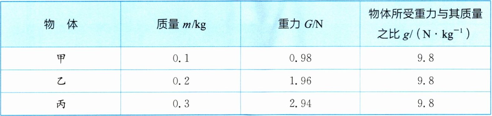 |物体|质量 $ m/kg $|重力 $ G/N $|物体所受重力与其质量之比 $ g/(N·kg^{-1}) $|