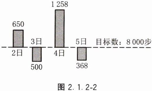 15. 如图$2.1.2 - 2$,小李在某运动应用(APP)中,设定了每天的步数目标为$8000$步,该APP用目标线上方或下方的柱状图分别表示每天超过或少于目标数的步数. 如$3$日,小李少于目标数的步数是$500$步,则从$2$日到$5$日这四天中小李一共走的步数是