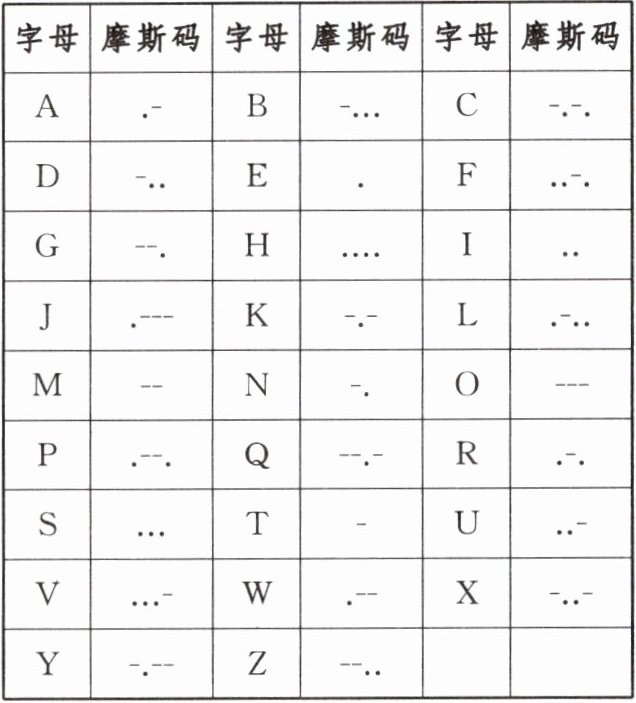 7. 摩尔斯电码(Morse Code)也被称作摩斯密码,是一种时通时断的信号代码,通过不同的排列顺序来表达不同的英文字母、数字和标点符号. 它发明于 1837 年,是一种早期的数字化通信形式. 它的代码包括五种:短促的点信号“•”,保持一定时间的长信号“—”,表示点和划之间的停顿、每个词之间中等的停顿,以及句子之间长的停顿. 以下给出 26 个英文字母与摩斯码的对应表: