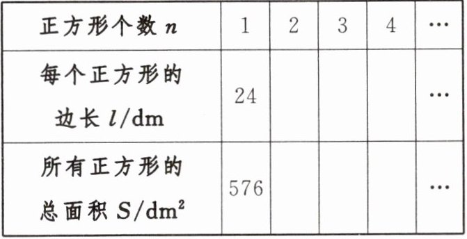 9.(1)12 8 6 288 192 144 (2)成反比例关系 成正比例关系 (3)l=$\frac{24}{n}$,S=l²=$\frac{576}{n²}$,第 8 个图形的边长是 3 dm,总面积是 9 dm²