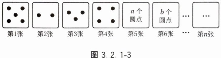 15. 如图 3.2.1 - 3 所示的是从左向右依次摆放序号分别为 $ 1 $,$ 2 $,$ 3 $,$ \cdots $,$ n $ 的卡片,每张卡片上均画有若干个小圆点,其中任意相邻的四张卡片上的小圆点数量之和相等.