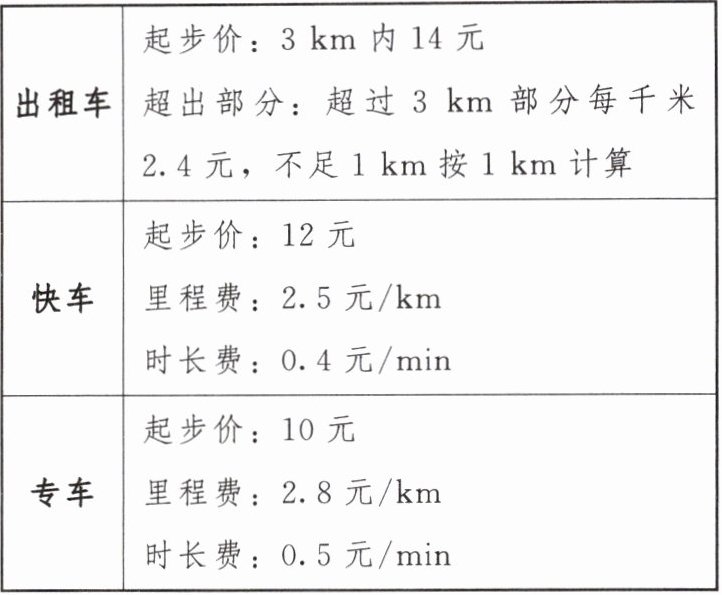 3. 某市有出租车、快车和专车三种网约车,收费标准如下表(该市规定网约车行驶的平均速度为40km/h):